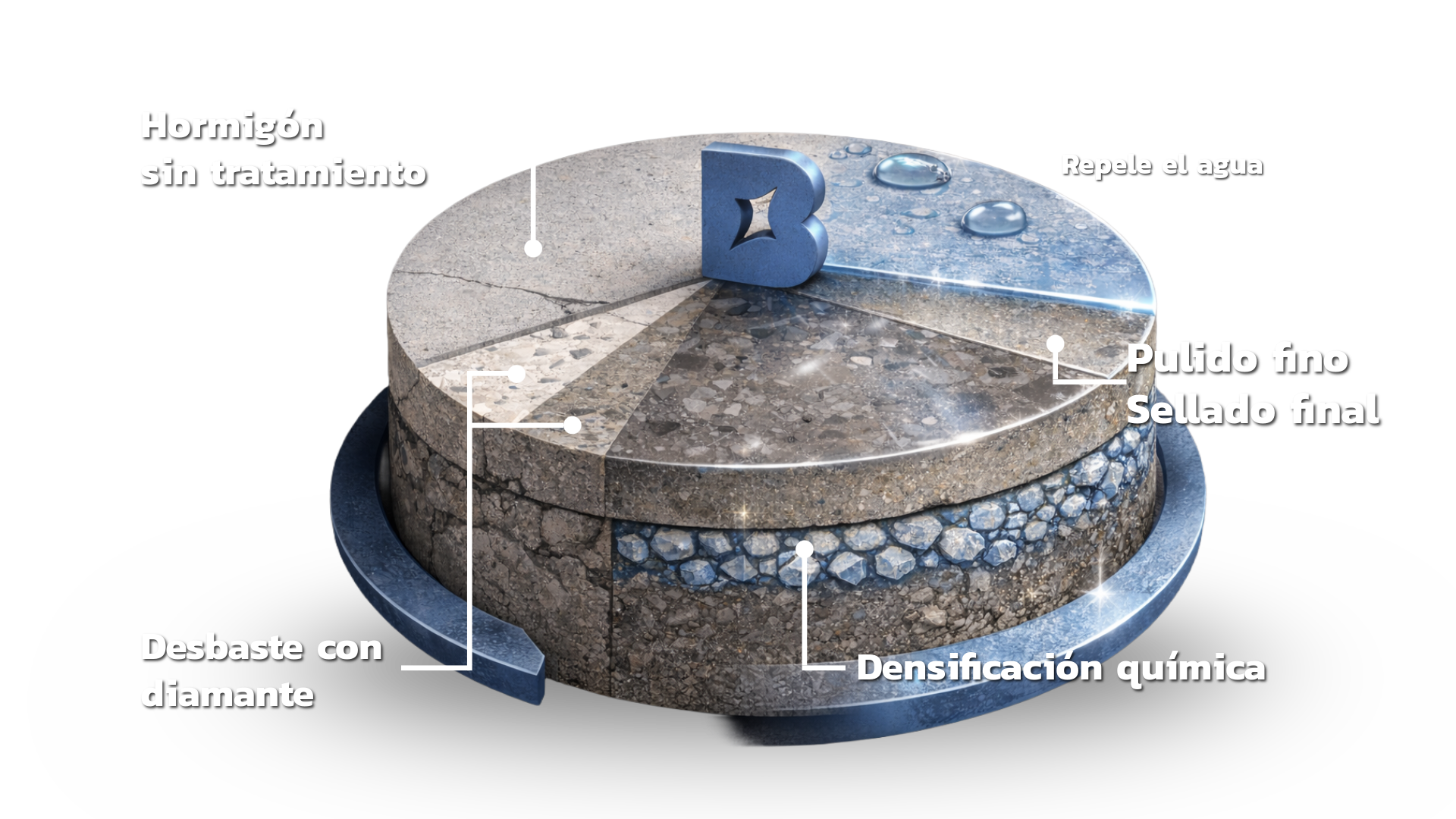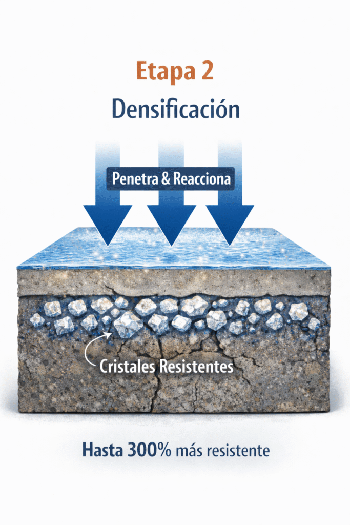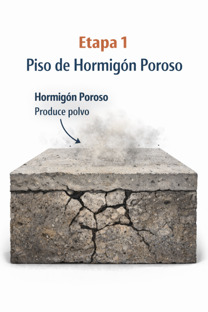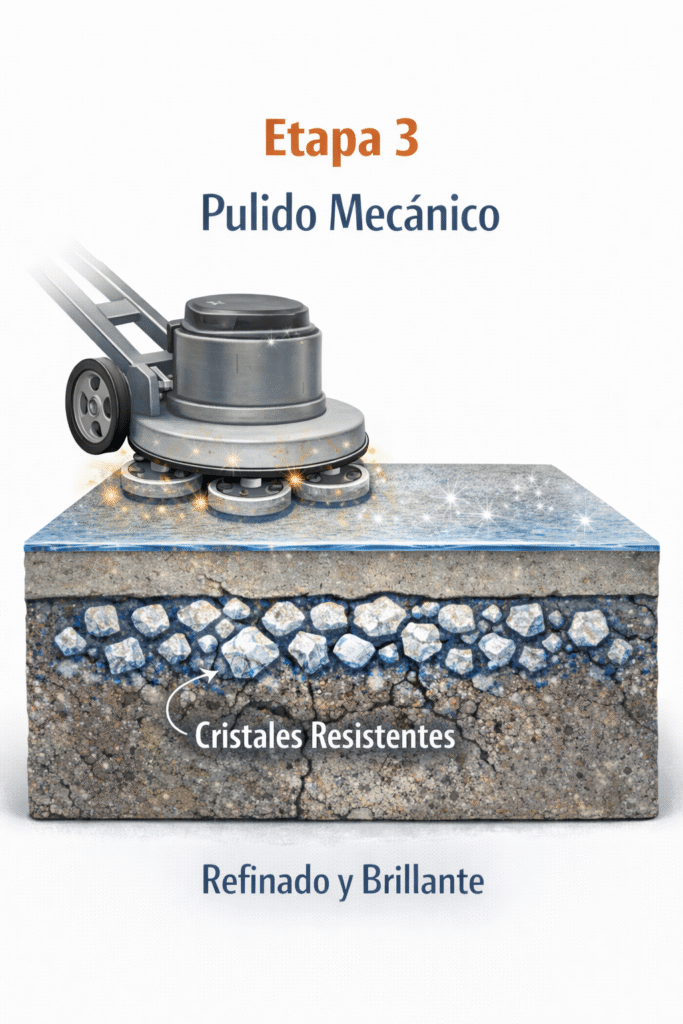 2 . Durante el pulido se aplican endurecedores químicos que reaccionan el la superficie del homrigón para fortalecerla y reducir la porosidad.